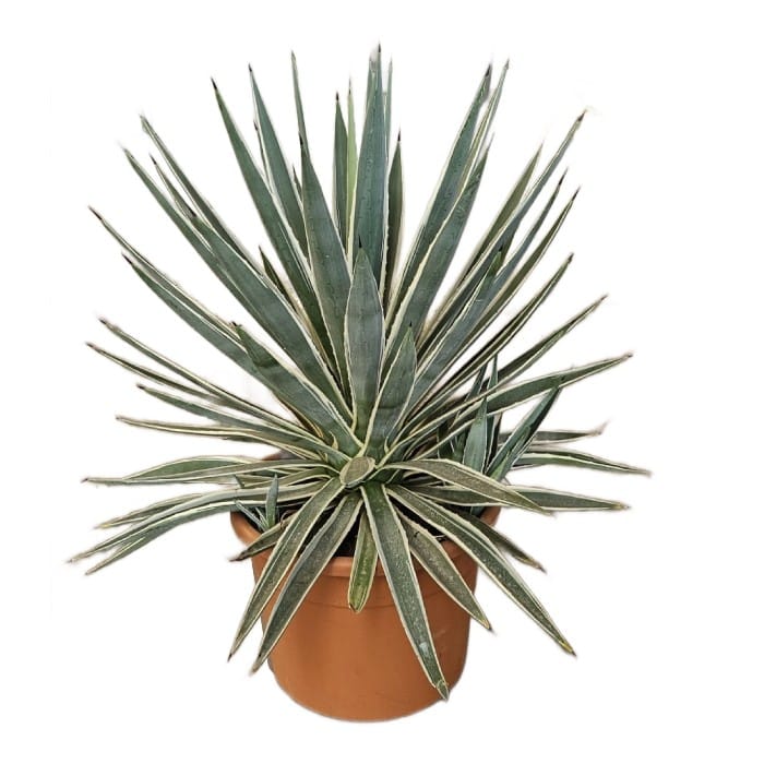 Forms symmetrical rosettes of narrow, variegated leaves with sharp tips. Moderate growth with a striking sculptural presence.