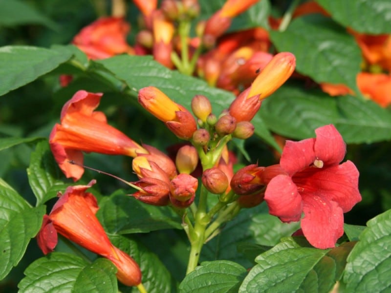 A vigorous, flowering climber known for its large trumpet-shaped orange-red blooms, perfect for walls, pergolas, and sunny facades.