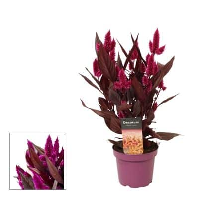 Produces striking plumed or crested flowers in mixed warm tones (rose, coral, amber, burgundy).