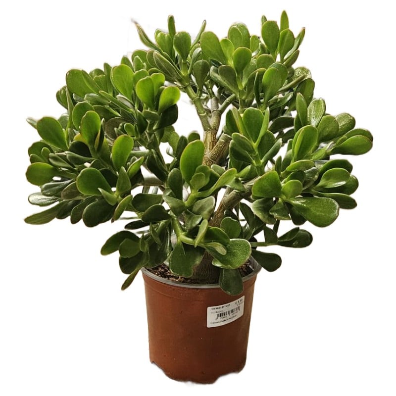 Features fleshy, oval green leaves that may develop red edges in bright sun. Slow-growing with a woody, tree-like form over time.