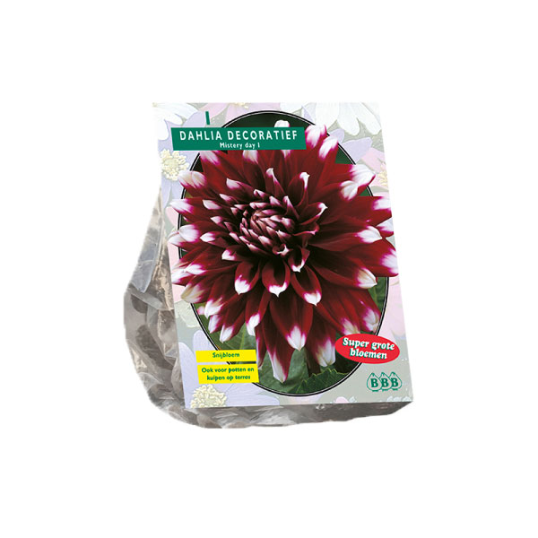 Add a touch of drama and intrigue to your summer garden with the spectacular Dahlia ‘Mystery Day’. This decorative variety is a true showstopper, featuring large, fully double blooms in a rich, deep burgundy-purple, with each petal dramatically tipped in crisp, pure white. The high-contrast colors make it one of the most visually striking dahlias available.