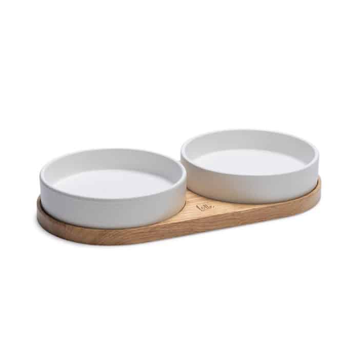 Let your cat eat at a level with the Designed by Lotte Dinner Set Lojs. The set consists of two removable ceramic trays fitted with wooden frames. This makes the trays stable and will not slide. Ceramic is hard-wearing and waterproof, so it is also suitable for wet food or water. To protect your cat’s sensitive whiskers, this cat food bowl is extra wide. So your cat doesn’t have to bump his or her whiskers against the edge. The Lojs Diner Set is available in white, and in combination with the light wood will provide a stylish, peaceful look within your interior. Another added benefit, these cat food bowls are dishwasher safe!