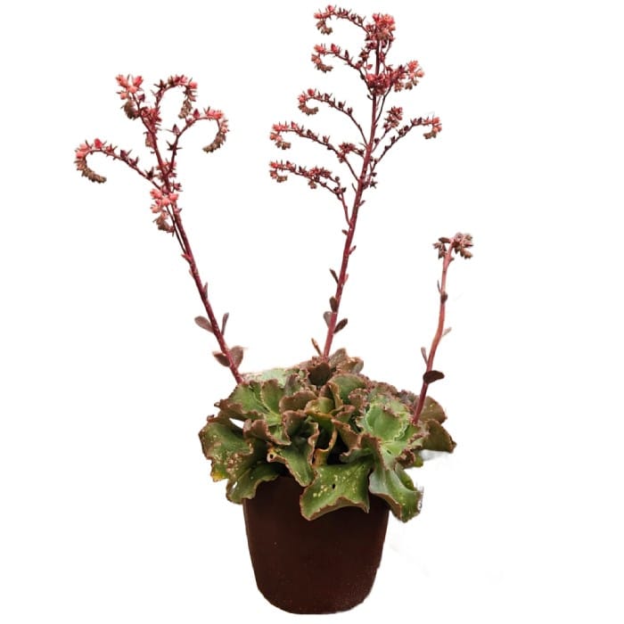 Large pink red rosette succulent with ruffled red-edged leaves, complemented by coral-orange flowers on tall stalks.