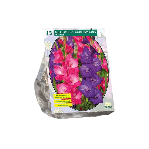 Large-flowered gladioli in a mix of purple-pink colors, ideal as a cut flower.