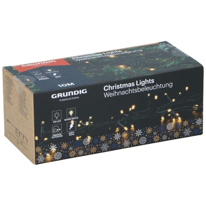 15m outdoor string with 120 warm white LEDs. 230V, IP44 water resistant. Perfect for festive garden or facade lighting.