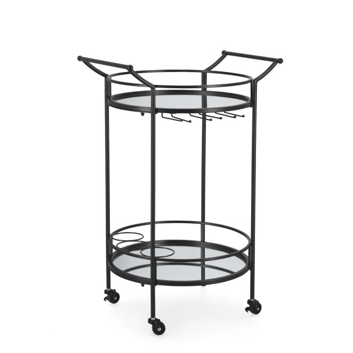 Epoxy powder painted steel structure with glass shelves and plastic wheels.