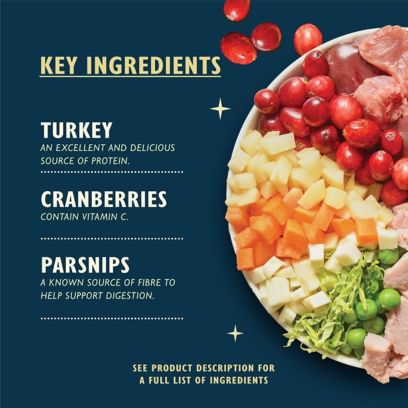 Turkey* (50%), Ham* (10%), Cranberries* (3%), Potatoes* (2%), Parsnips* (2%), Carrots* (2%), Cabbage* (1%), Peas* (1%), Minerals, Sage*, Thyme*, Goldenrod*, Nettles*, Aniseed*, Rosehips*, Marigold Flowers*, Cleavers*, Chickweed*, Alfalfa*, Milk Thistle*, Dandelion Root*, Burdock Root*, Celery Seeds*. *Natural Ingredient.