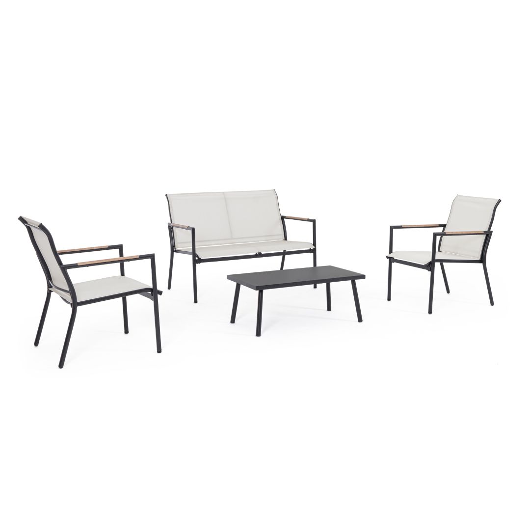 Structure in steel treated for outdoor use through phosphating and powder coated (polyester). Textilene seats and backrests. Steel armrests with wood-effect steel insert.