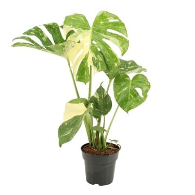 Evergreen with large, split leaves featuring creamy-white variegation.