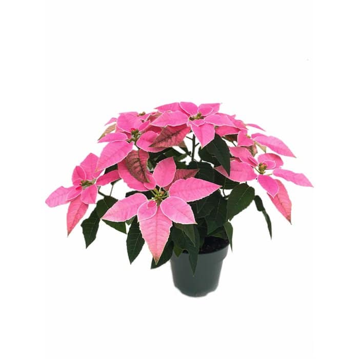 Poinsettias, Euphorbia pulcherrima, are attractive house plants with dark green leaves and leafy pink ‘bracts’ that surround the green-yellow flowers in December and January. They’re commonly used to decorate the home at Christmas.
