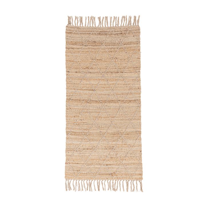 Natural jute rug with a decorative diamond pattern and fringes in a beige shade.