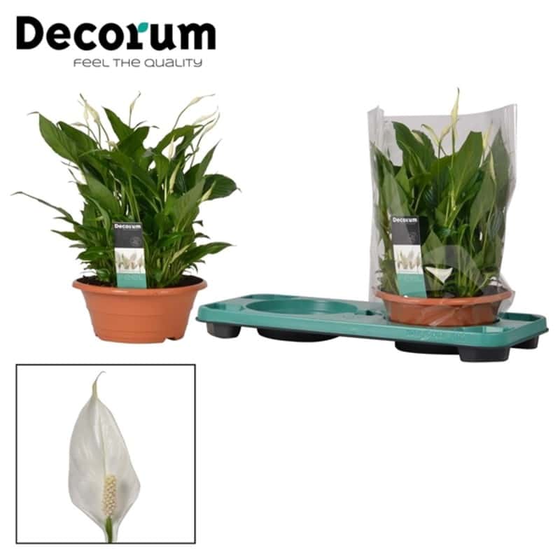 Produces elegant white spathes over summer; blooms may repeat throughout the year under good care.