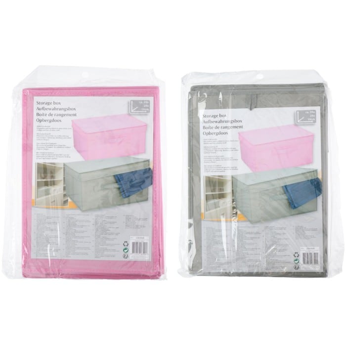 Spacious storage box with lid. Perfect for organizing clothes, toys or other items, keeps contents dust-free and stackable. Price is for one box only, assorted colours.