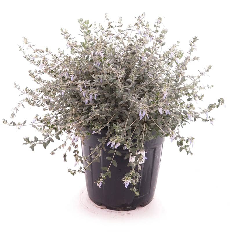 Evergreen shrub with silvery-grey leaves and small lavender-blue flowers.